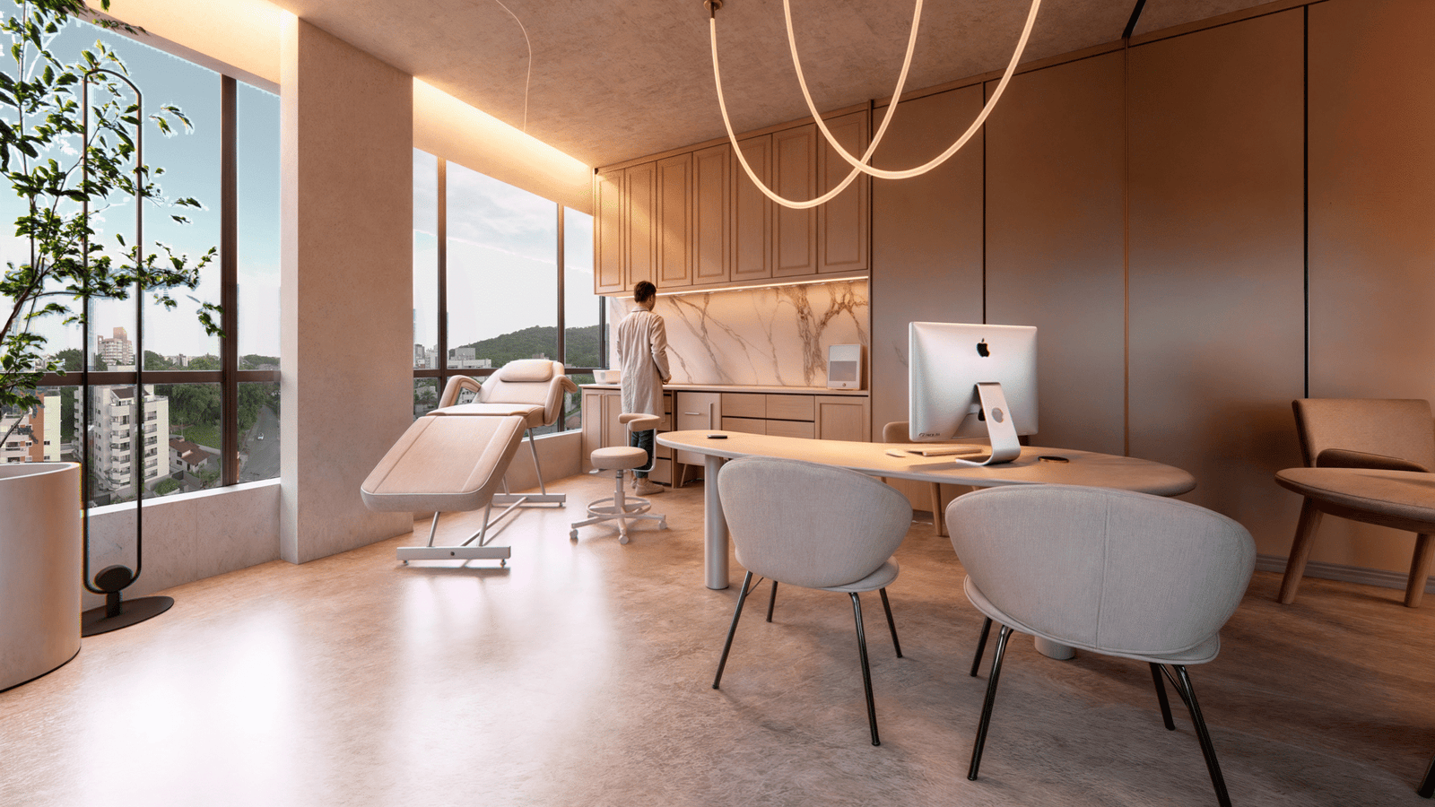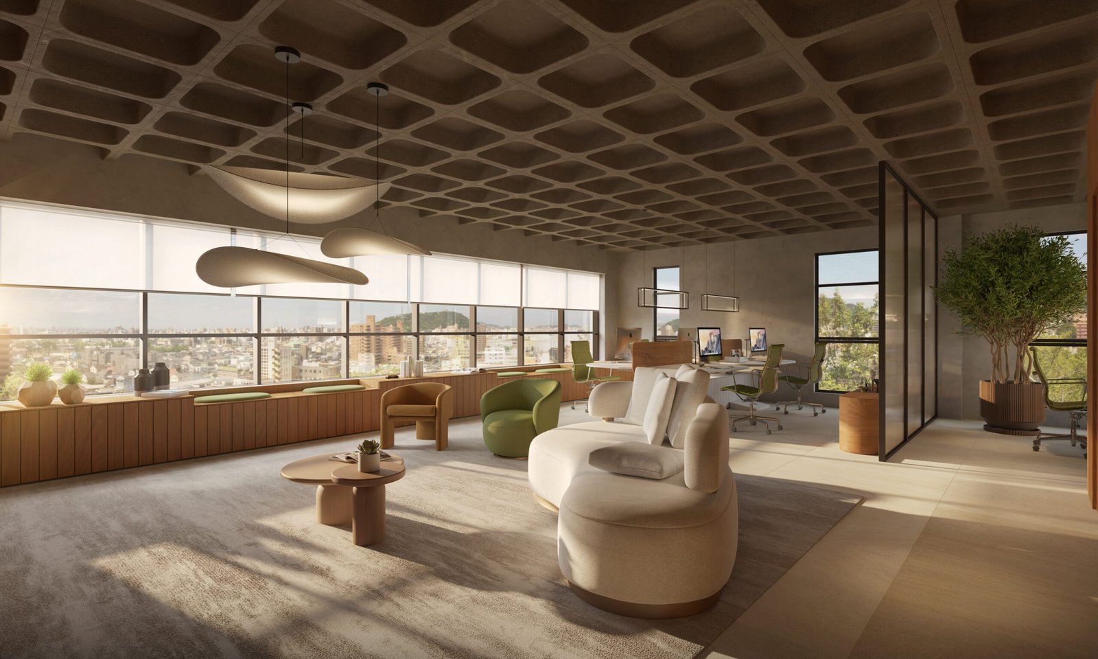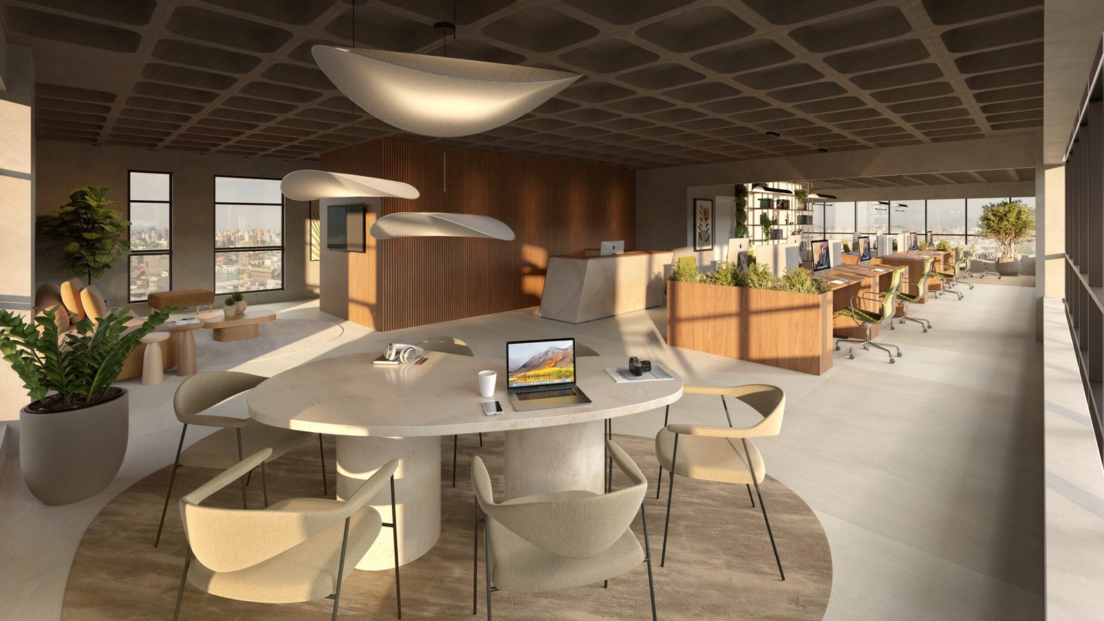 Iluminação eficiente e mobiliário de alto padrão nos ambientes de convivência e circulação.